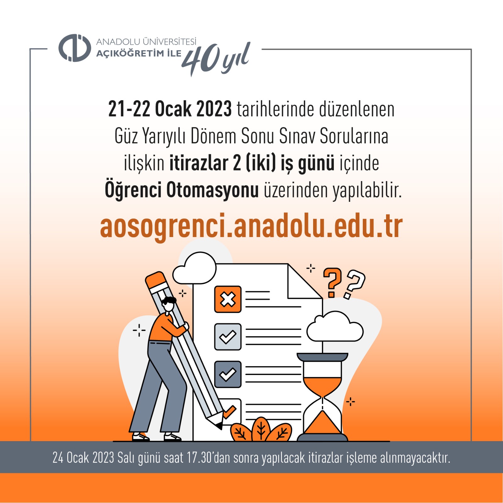 Sınav sorularına ve sınav uygulamasına itirazlarınızı 2 (iki) iş günü içinde https://aosogrenci.anadolu.edu.tr/ adresindeki Öğrenci Otomasyonu üzerinden yapabilirsiniz.